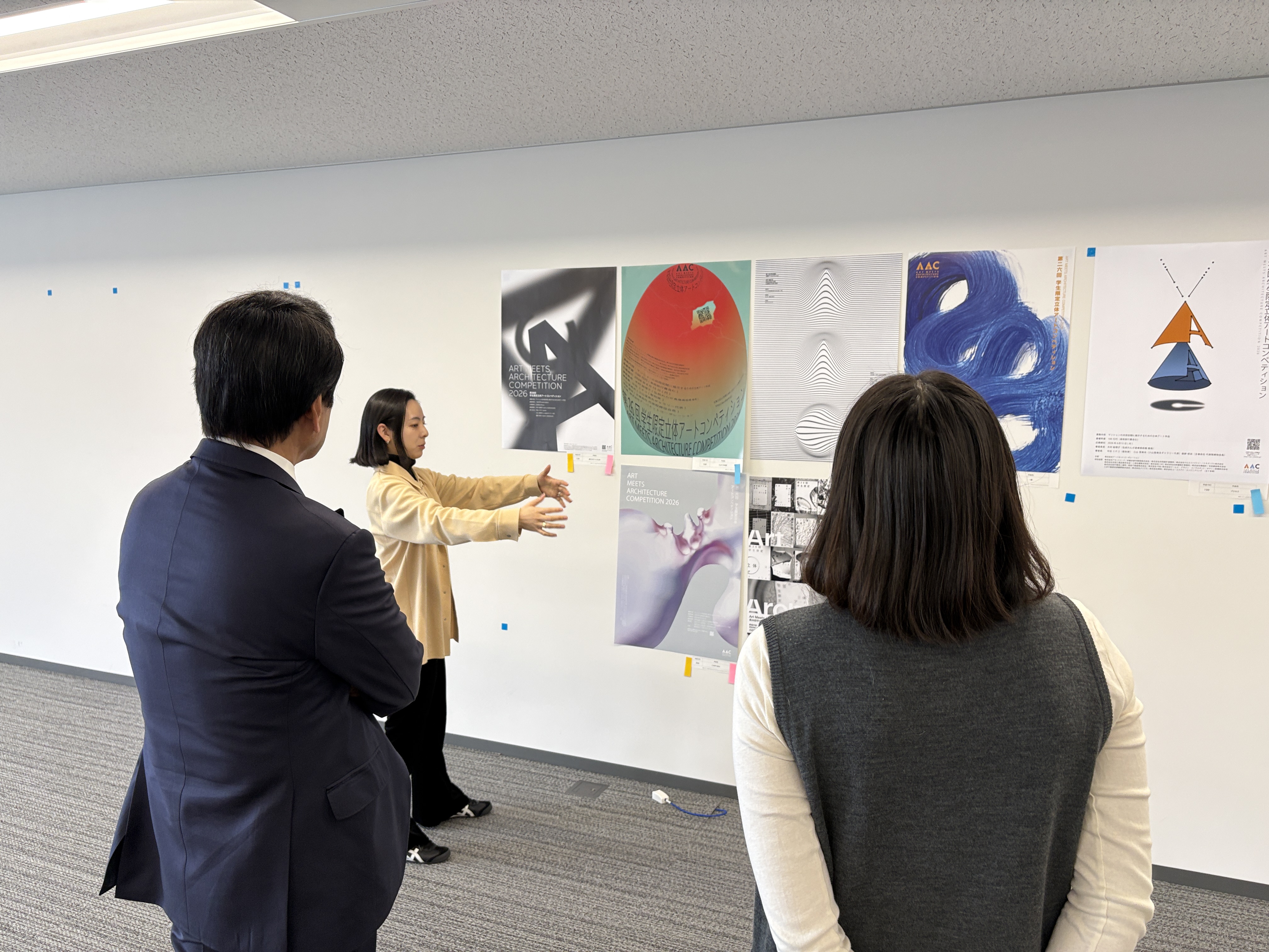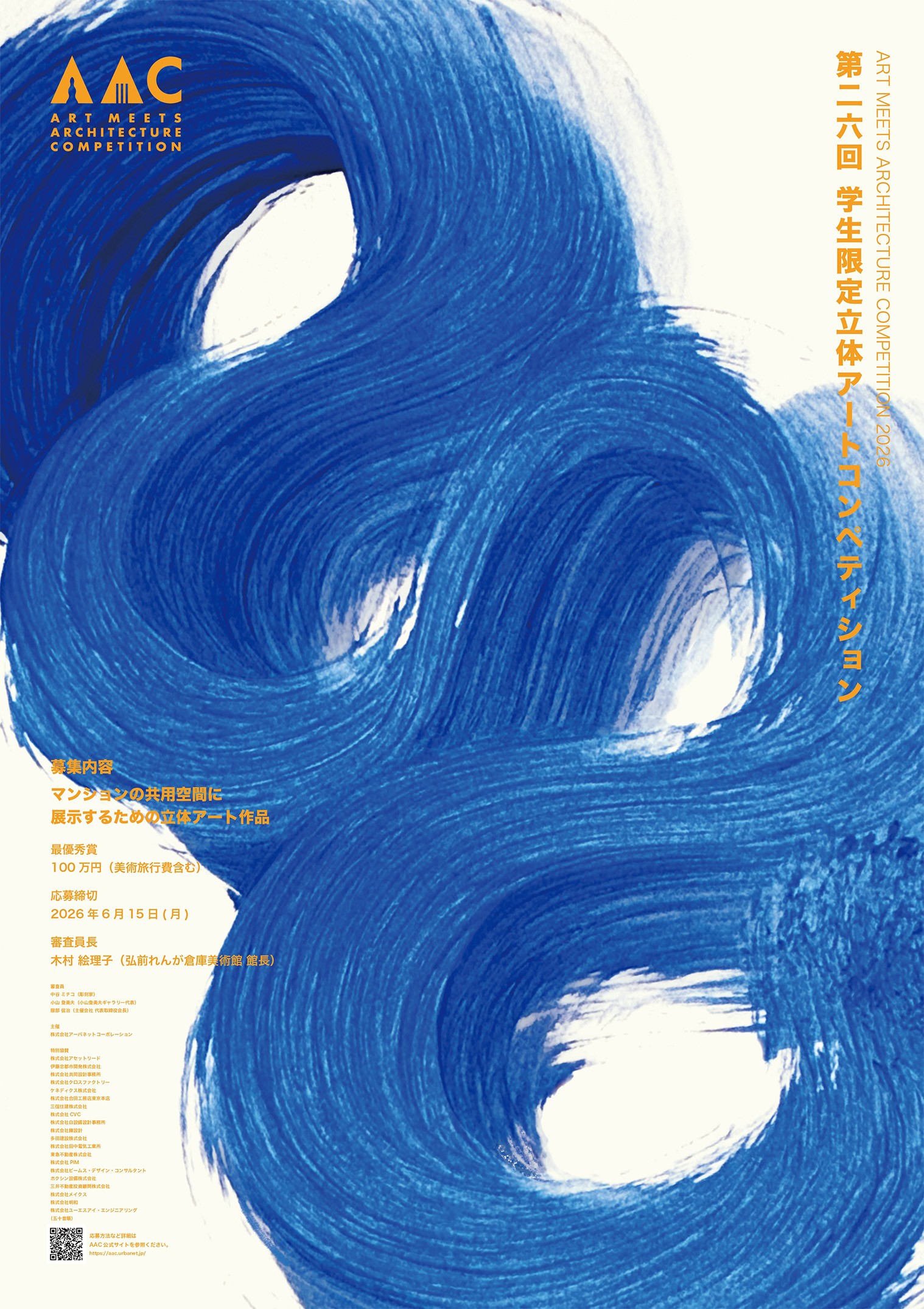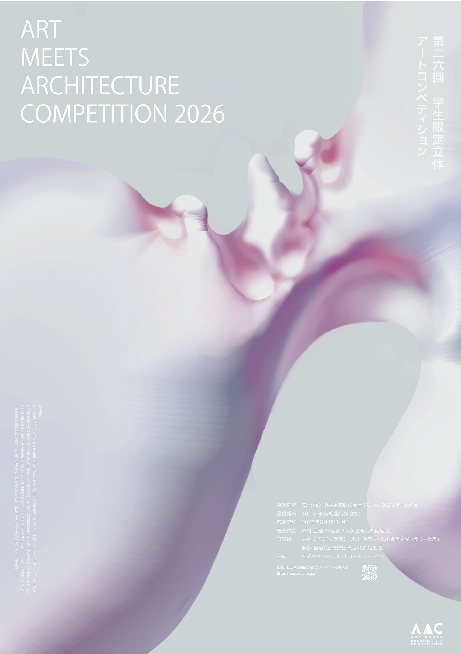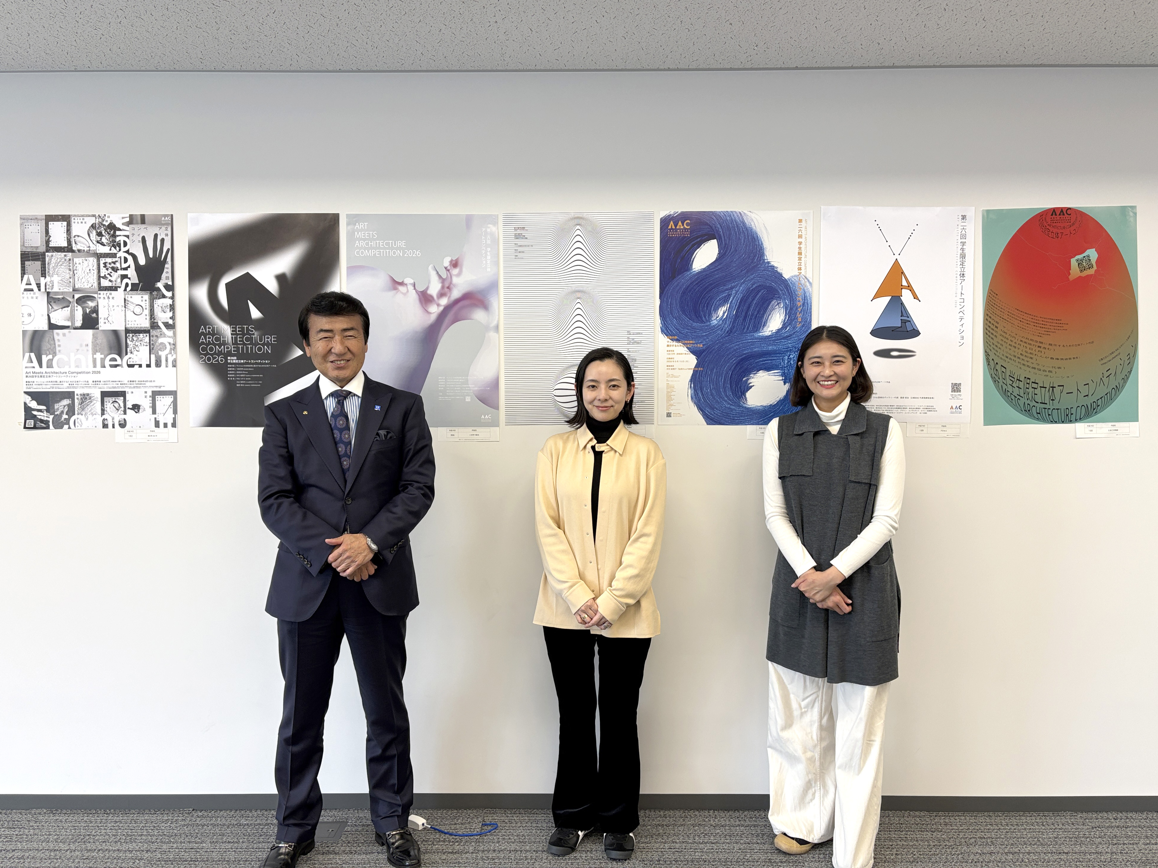 AACポスターコンペは、大賞作品をブラッシュアップして実施に繋げるというプロセスに大きな意義を感じました。単にユニークな表現を評価するだけでなく、立体作品を制作する学生が応募したくなるかという視点も重視しながら審査を行いました。みなさんの「立体」というテーマの解釈の豊かさに驚かされました。 最優秀賞の大島さんのポスターは、パールがかった不思議な造形に、まず視線が引き寄せられ、「これは何だろう」と思わせる力がありました。後にそれが拳で握った痕跡であると気づき、強い身体性とコンセプトが立ち上がってきます。デザインにおいて明快さは重要ですが、同時に最初の「?」によって鑑賞者の視線を捉えることもまた大切です。何かを掴み取ろうとする挑戦的なアクションが、力強いけれど軽やかに、美しく可視化されています。立体作品のコンペであることが直感的に伝わると同時に、まだどんな形にもなり得る可能性の塊のような感覚が、このポスターから立ち上がってきました。