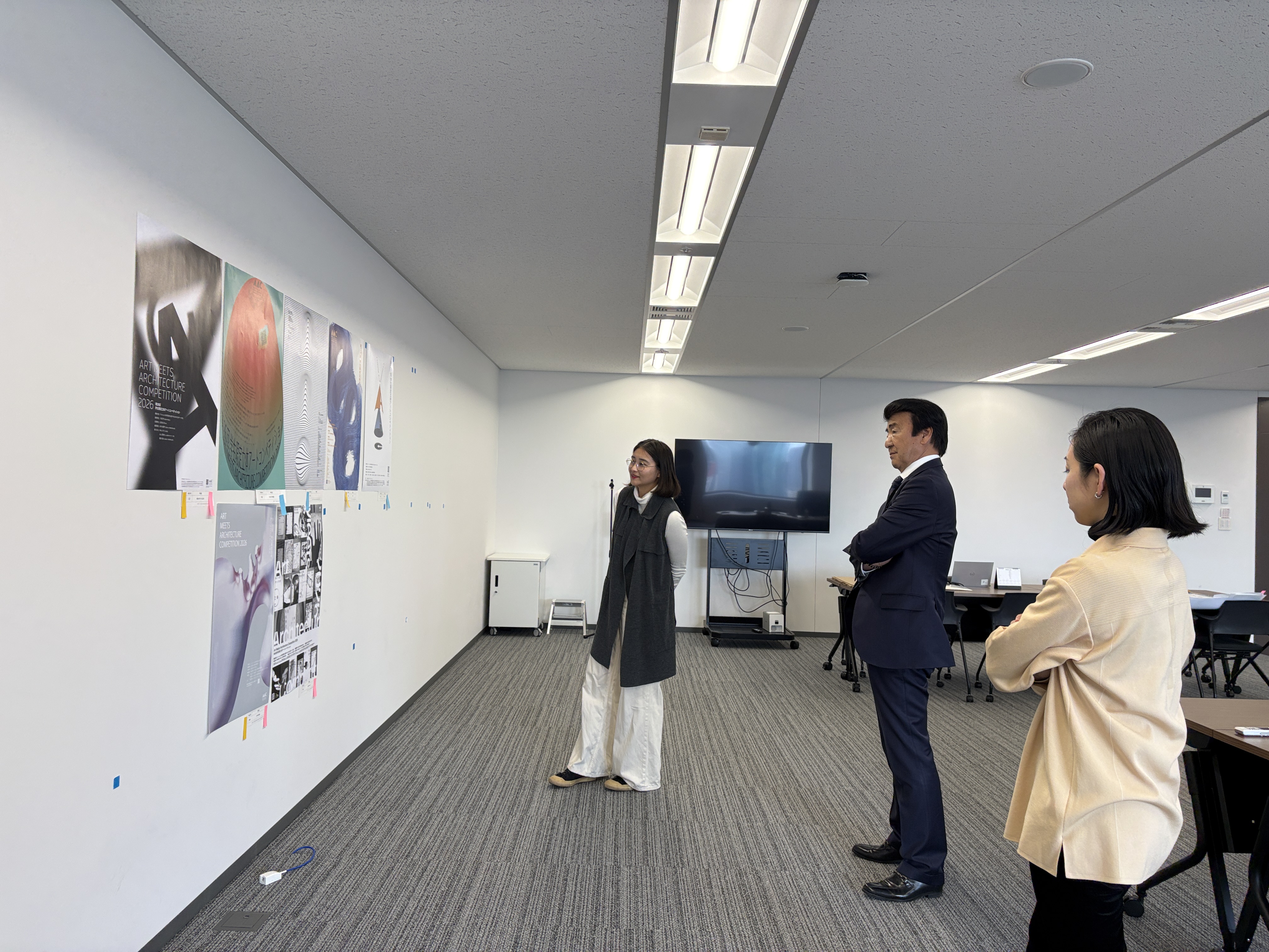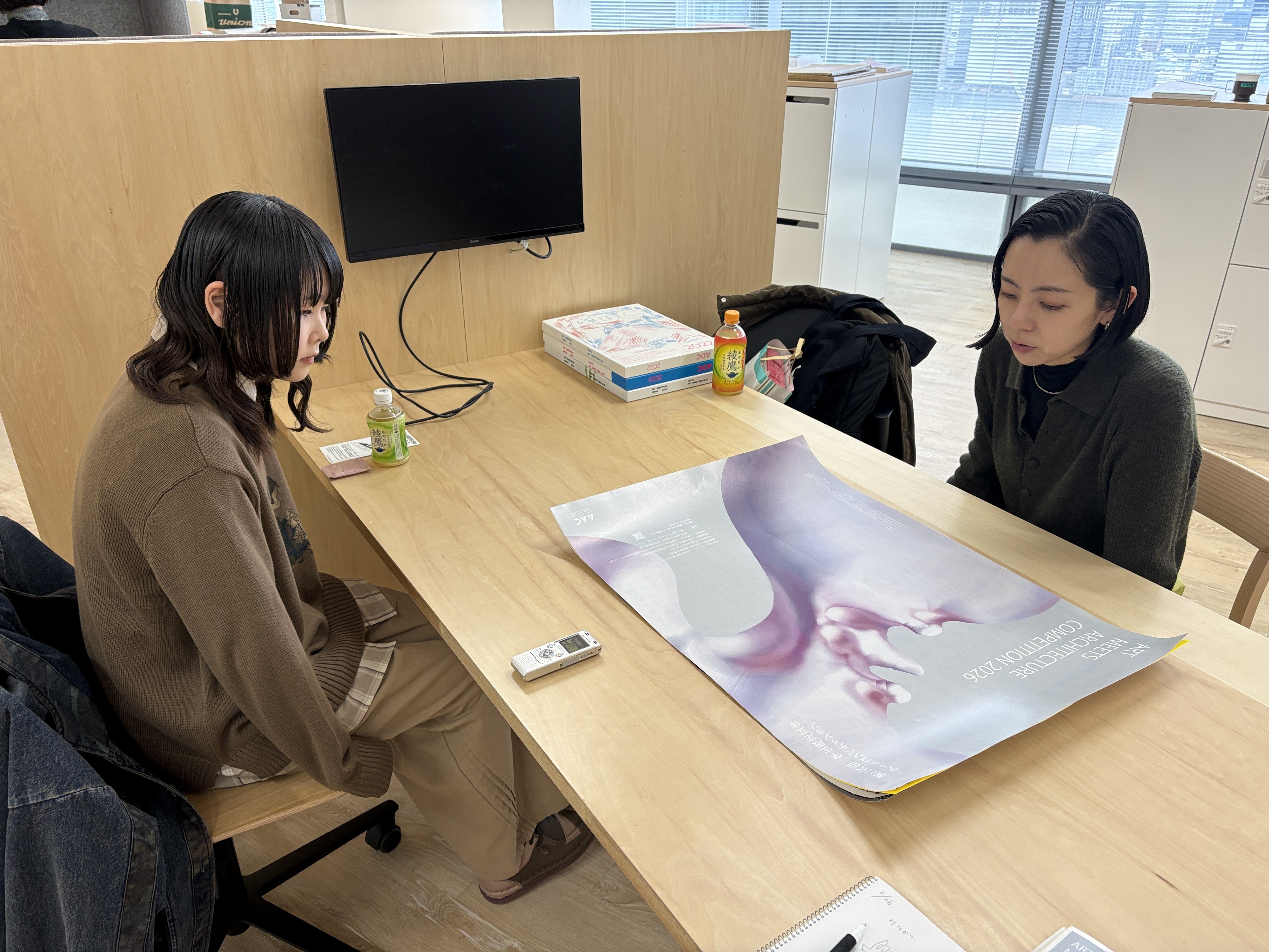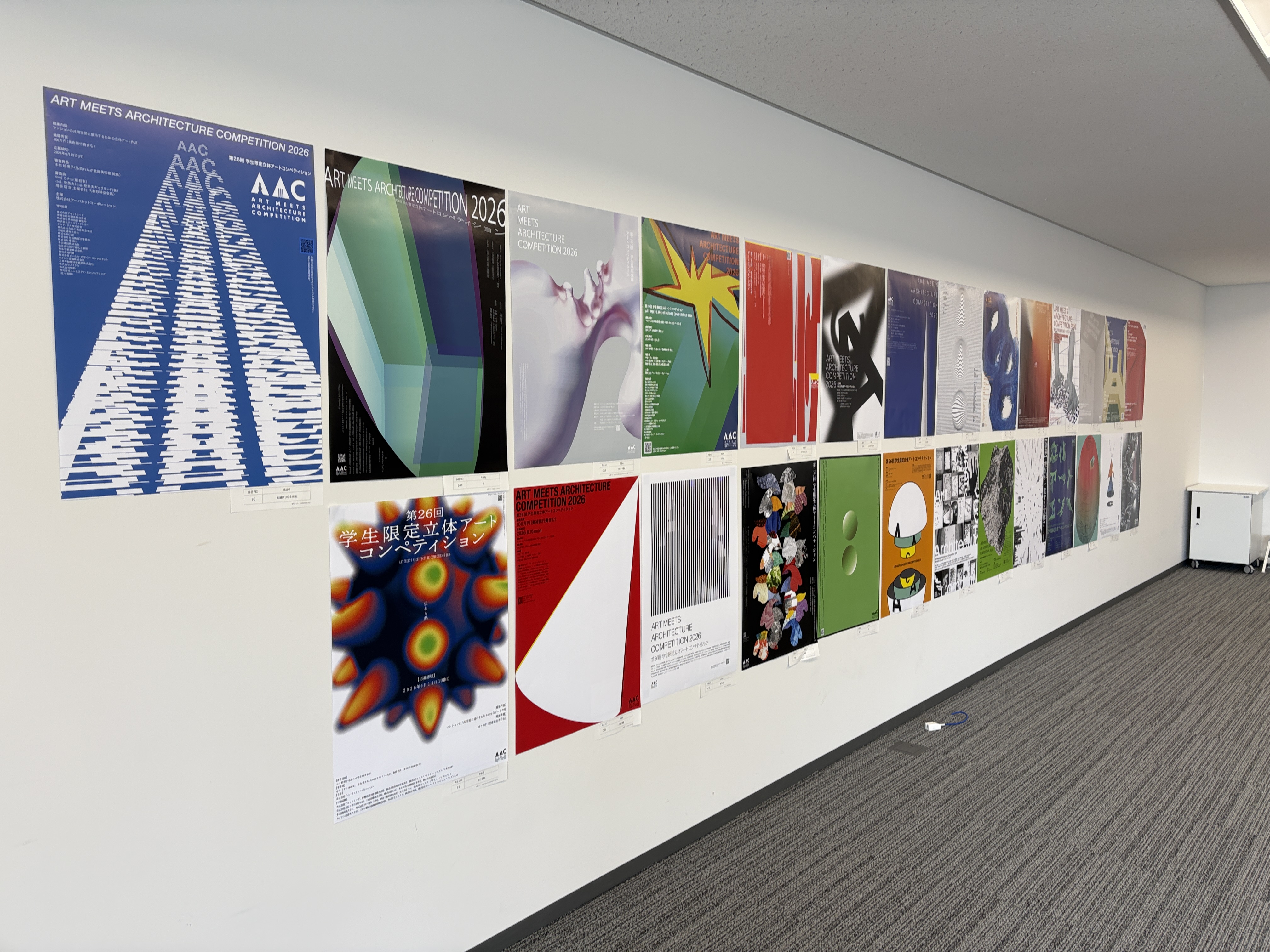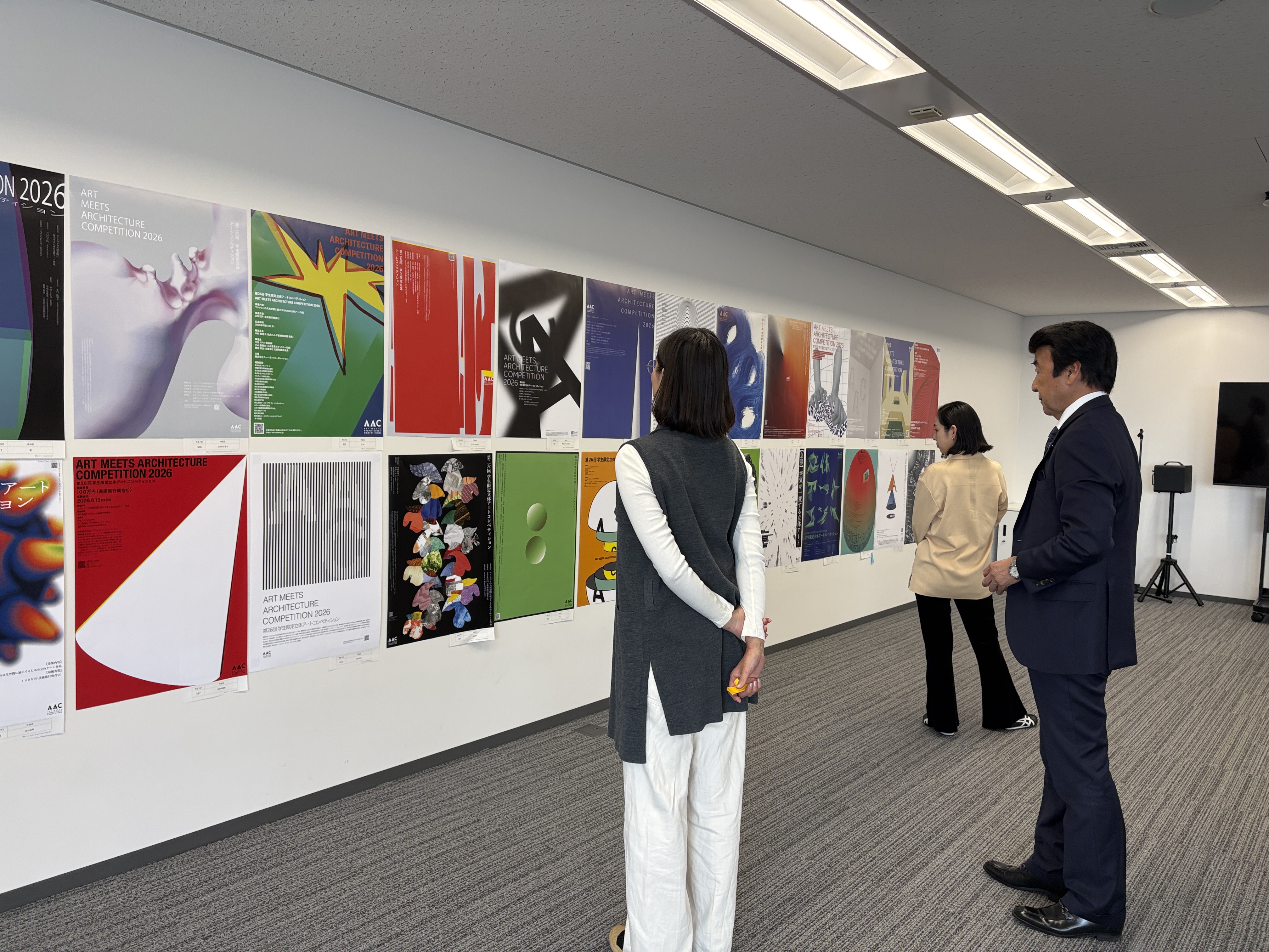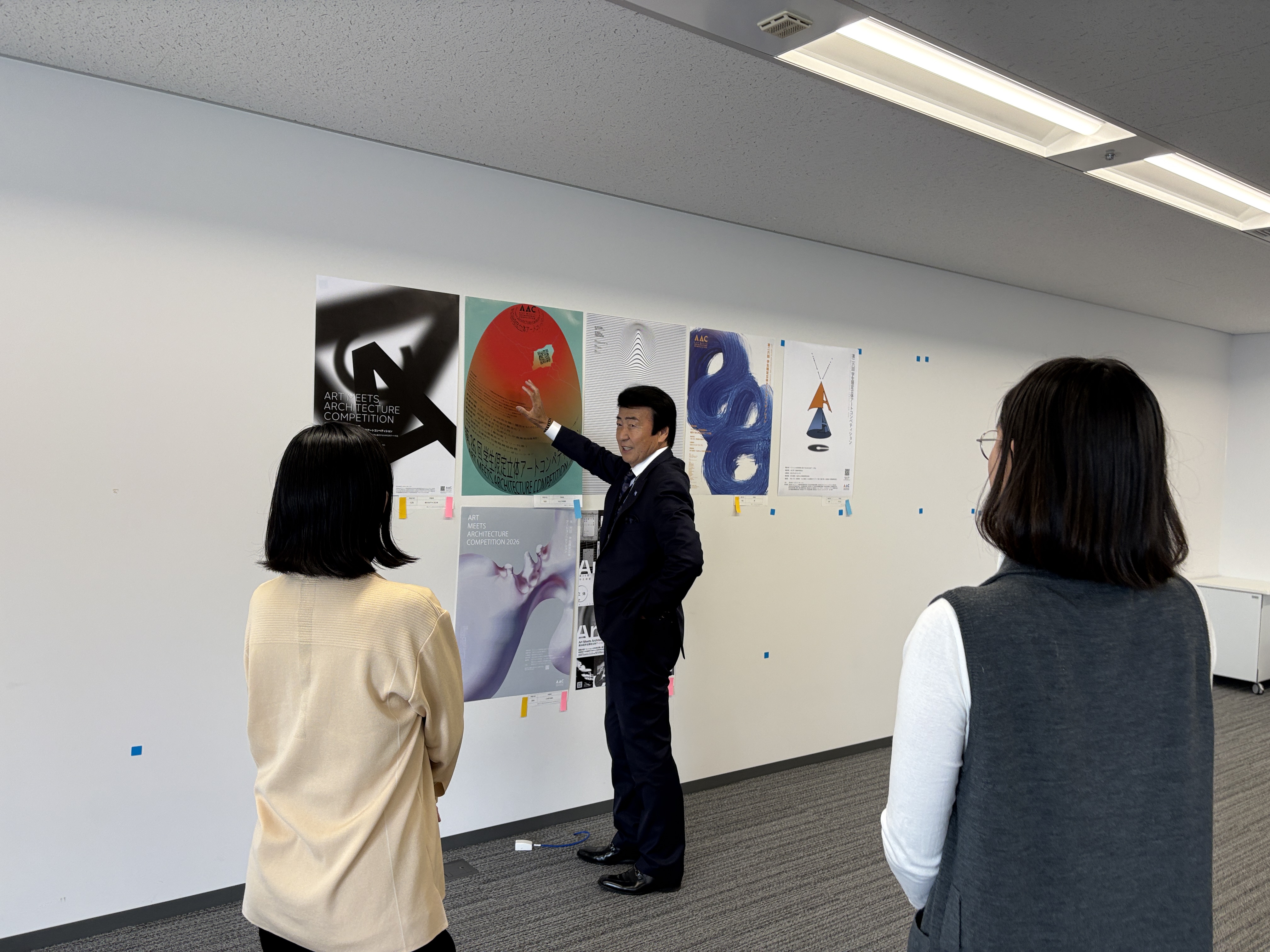 AACポスターコンペは、大賞作品をブラッシュアップして実施に繋げるというプロセスに大きな意義を感じました。単にユニークな表現を評価するだけでなく、立体作品を制作する学生が応募したくなるかという視点も重視しながら審査を行いました。みなさんの「立体」というテーマの解釈の豊かさに驚かされました。 最優秀賞の大島さんのポスターは、パールがかった不思議な造形に、まず視線が引き寄せられ、「これは何だろう」と思わせる力がありました。後にそれが拳で握った痕跡であると気づき、強い身体性とコンセプトが立ち上がってきます。デザインにおいて明快さは重要ですが、同時に最初の「?」によって鑑賞者の視線を捉えることもまた大切です。何かを掴み取ろうとする挑戦的なアクションが、力強いけれど軽やかに、美しく可視化されています。立体作品のコンペであることが直感的に伝わると同時に、まだどんな形にもなり得る可能性の塊のような感覚が、このポスターから立ち上がってきました。