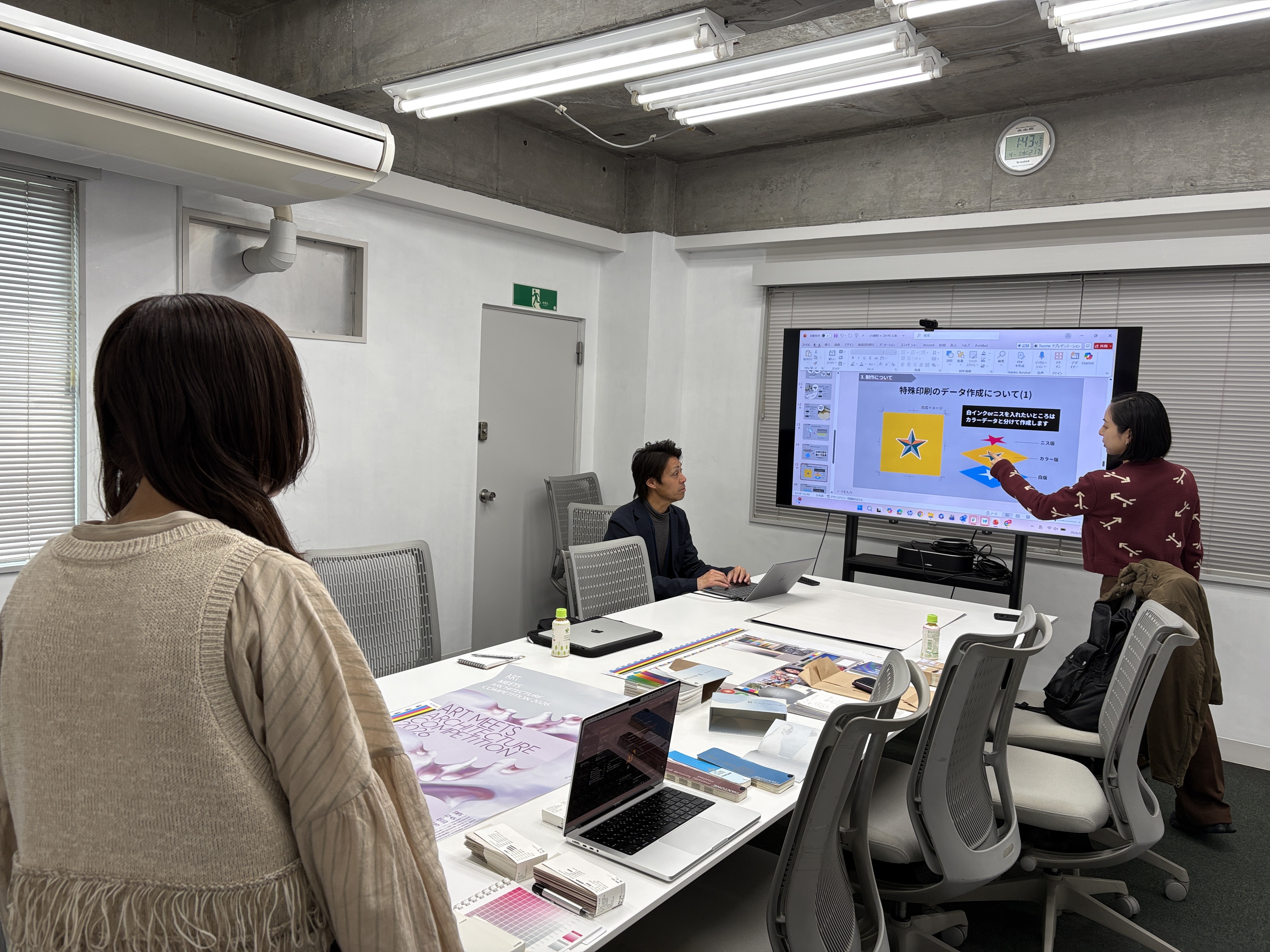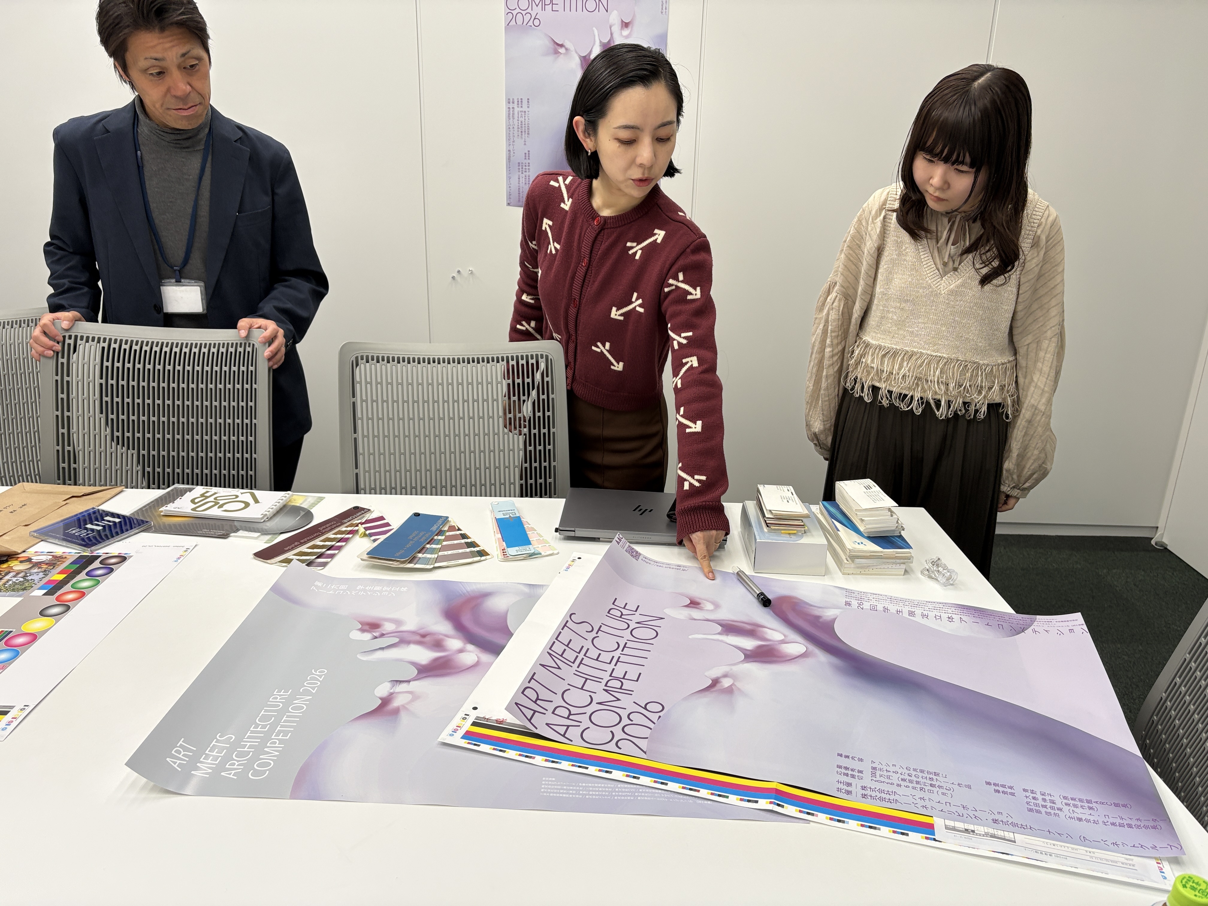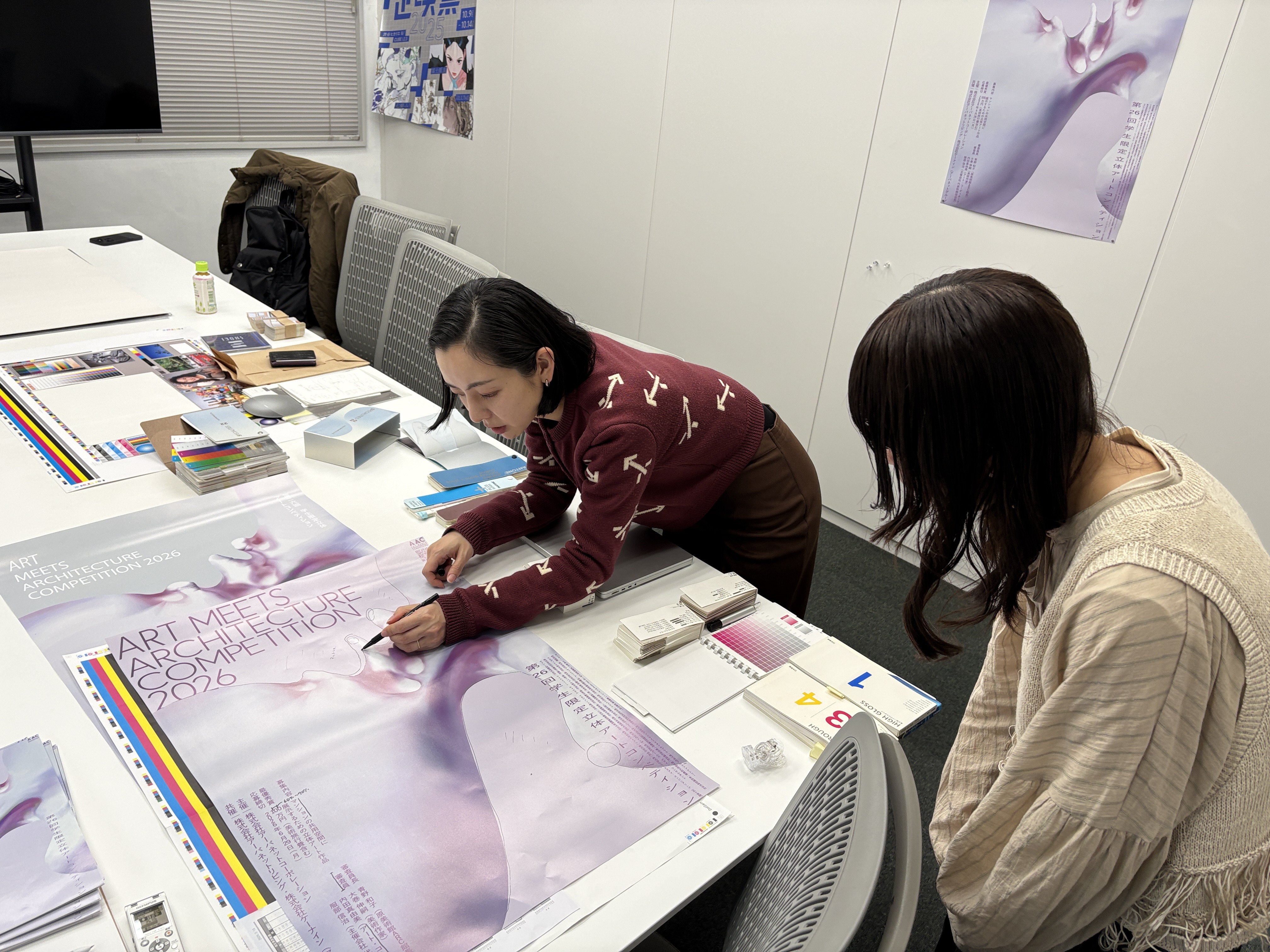 ポスターコンペの審査後、田中せり氏と最優秀賞受賞者の大島愛未さんが打ち合わせを行い、メインビジュアルとなる粘土造形について物理的な検証を実施するとともに、デジタル化に際しての再現精度を高めました。 さらに、もう一つの重要な要素であるフォントの選定や配置にも細心の注意を払い、メインビジュアルとの調和を図りながらブラッシュアップを重ねて完成したのが、下記右側の作品です。 最終的な印刷工程では、CMYKの4色に加え、シルバーの特色印刷およびニス加工を施し、物体と背景にコントラストを持たせることで、平面でありながら奥行きを感じさせる、AACの特性を体現したポスターに仕上げました。